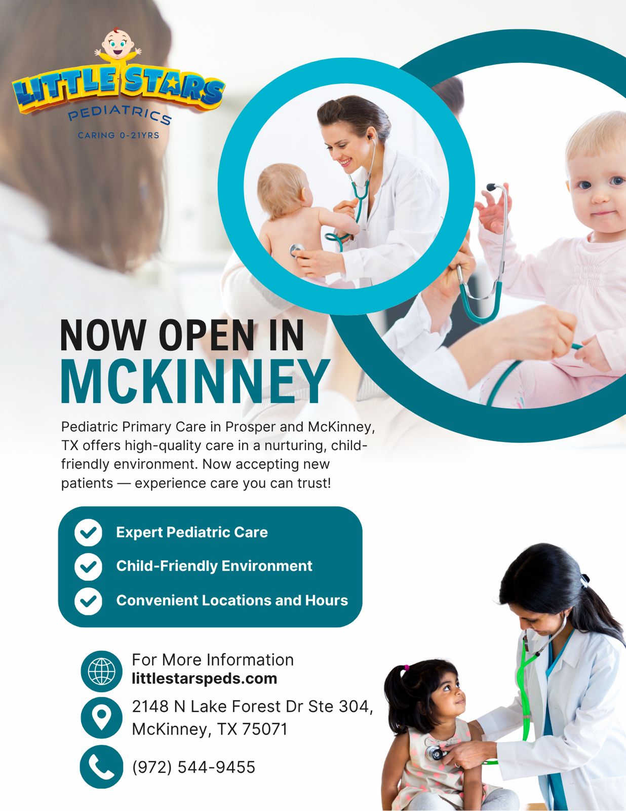 Welcome to Little Stars Pediatrics, a Pediatric Primary Care Offices in Prosper, TX and McKinney, TX. We have a great pleasure in welcoming you to our family friendly pediatric clinic, which provides comprehensive healthcare services in a good caring environment. We are accepting new patients, give us an opportunity to serve you so that you will be pleased with the quality of care and services rendered.